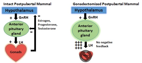 To understand why LH might be part of the puzzle, it is important to review what happens when dogs receive a gonadectomy. Estrogen, progesterone and testosterone are hormones produced mainly in the sex organs. Normally in a mature intact dog, the brain structure called the hypothalamus stimulates the pituitary gland to release LH. It travels throughout the body and stimulates the sex organs to produce steroid hormones (estrogen/progesterone in females or testosterone in males). When the sex hormones are high enough, it tells the hypothalamus and pituitary to stop releasing LH, creating a negative feedback loop. The problem with LH occurs after spay and neuter, which removes the sex organs and the steroid hormones they produce. There is no longer a message to the brain to stop releasing LH. In spayed and neutered dogs, LH levels can be quite high.