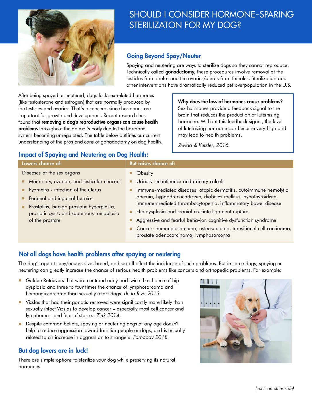 On this page, you’ll find an overview of research on the health effects of spaying or neutering, along with references and other resources. Visit our Hormone-sparing methods page to learn more about hysterectomy (also called ovary-sparing spay) for females and vasectomy for males to sterilize while preserving hormones for your pet.